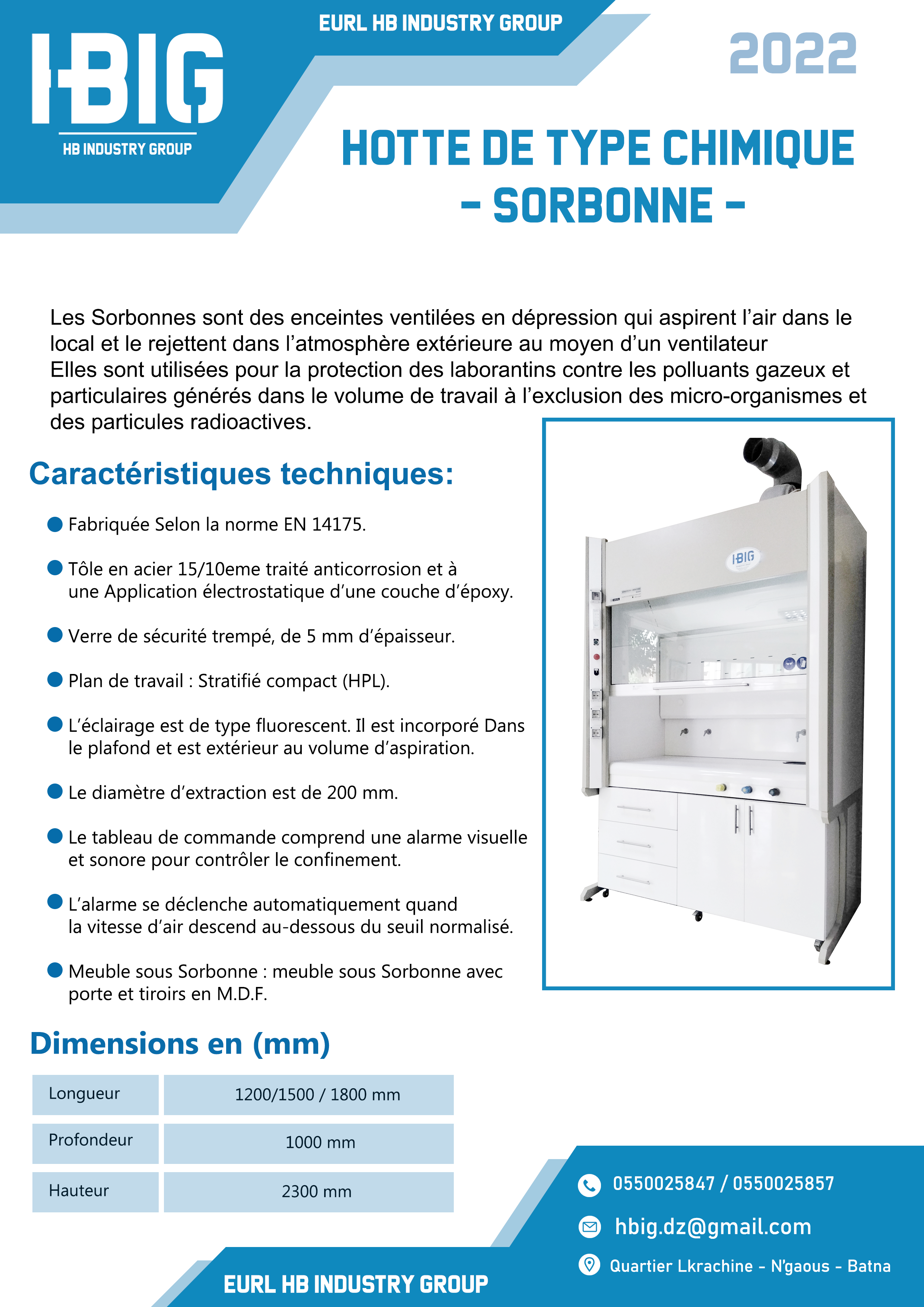 SORBONNE STANDARD POUR MANIPULATIONS CHIMIQUES 180 CM DE LARGE